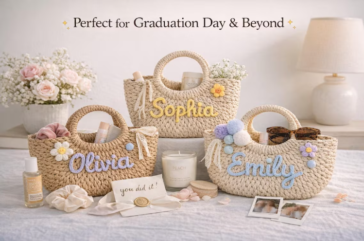 Celebrate her biggest milestone with a gift she’ll actually use and cherish. Our Personalized Woven Straw Tote Bag is more than just a summer accessory—it’s a heartfelt keepsake for graduation day, bridesmaid proposals, dorm move-ins, and sunny days ahead. Handcrafted with care and customized with her name in soft, colorful yarn, each bag blends boho charm with everyday practicality. Lightweight, stylish, and made to be part of her next chapter.