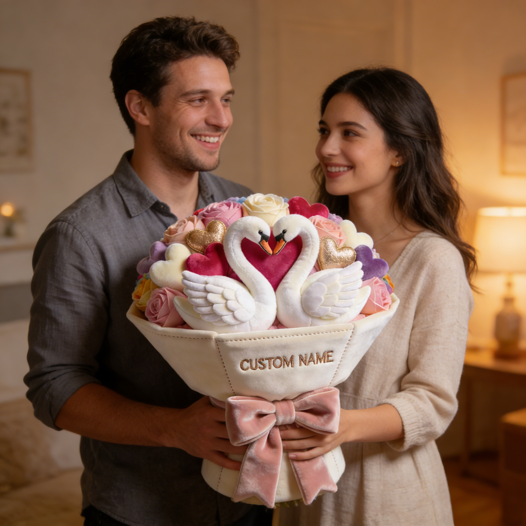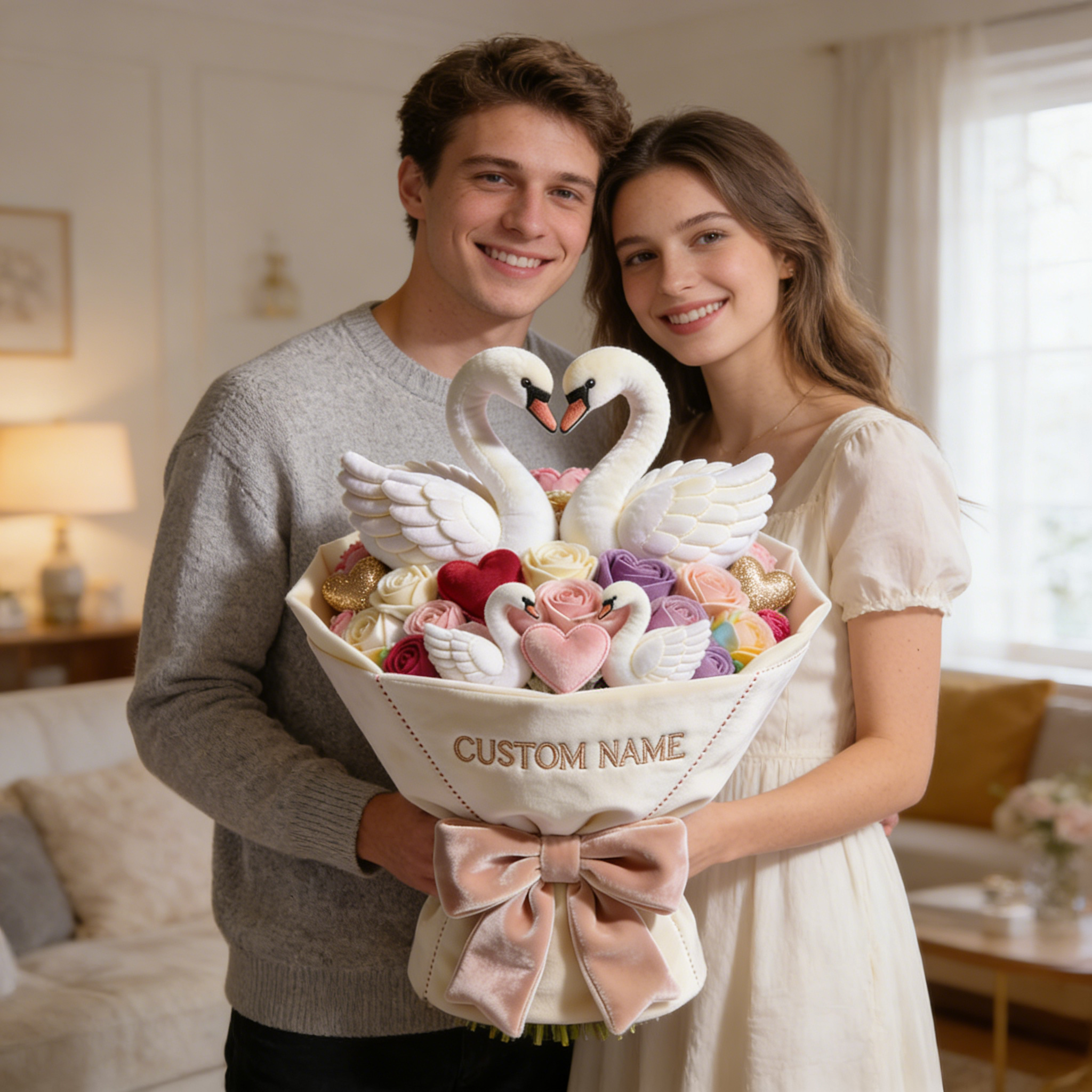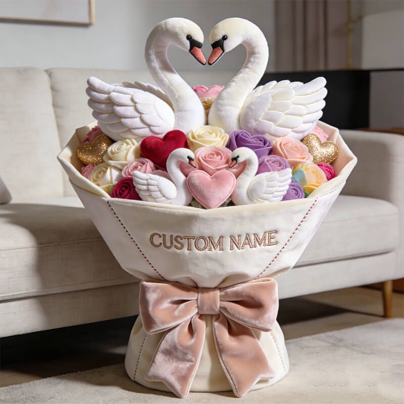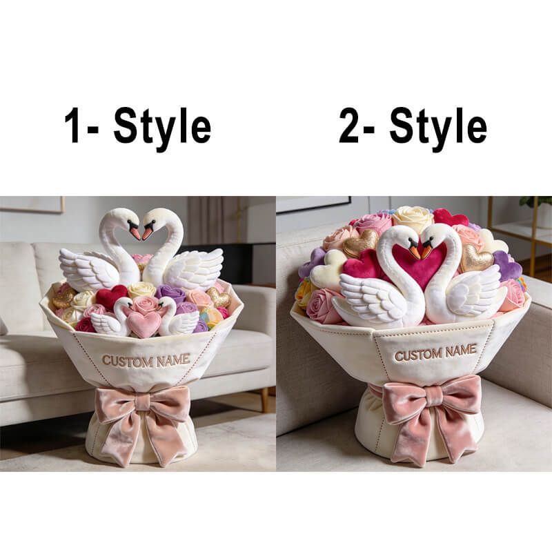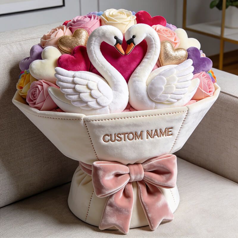 Personalized valentine's day heart swan bouquet themed pillow
